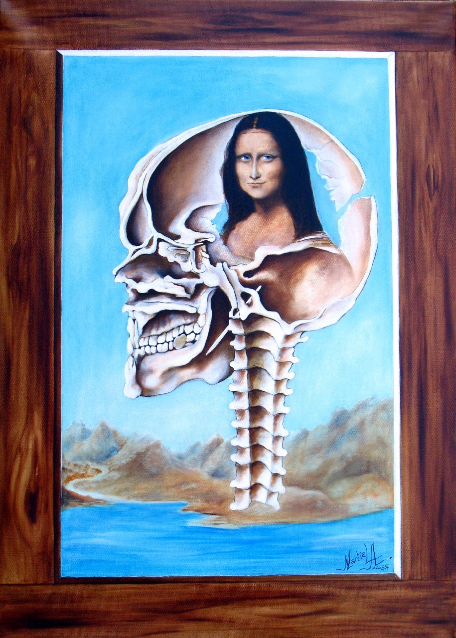 "Une Joconde dans la tête" huile sur toile , 50 cm X 70 cm avec le cadre peint en trompe l'oeil.